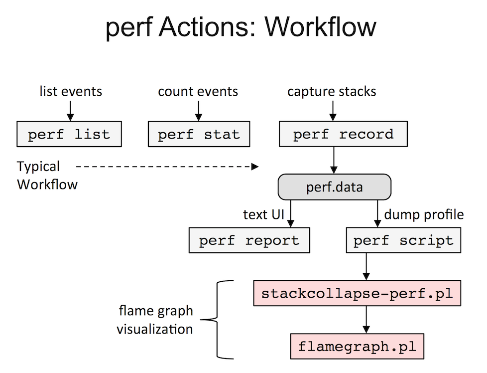 I summarized this flame graph generation sequence in my SCALE13x presentation, shown on the right. Since the "perf" command can output profile data in different ways, can't it just emit folded format directly, eliminating the need for reprocessing in stackcollapse-perf.pl? It's not ideal, since we still must dump each event via perf.data and reprocess in user space (instead of aggregating in kernel space, which BPF will do later on), but it would be a big improvement.