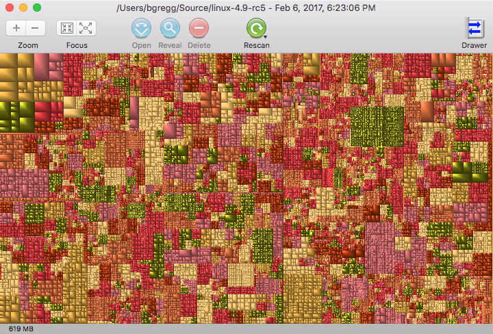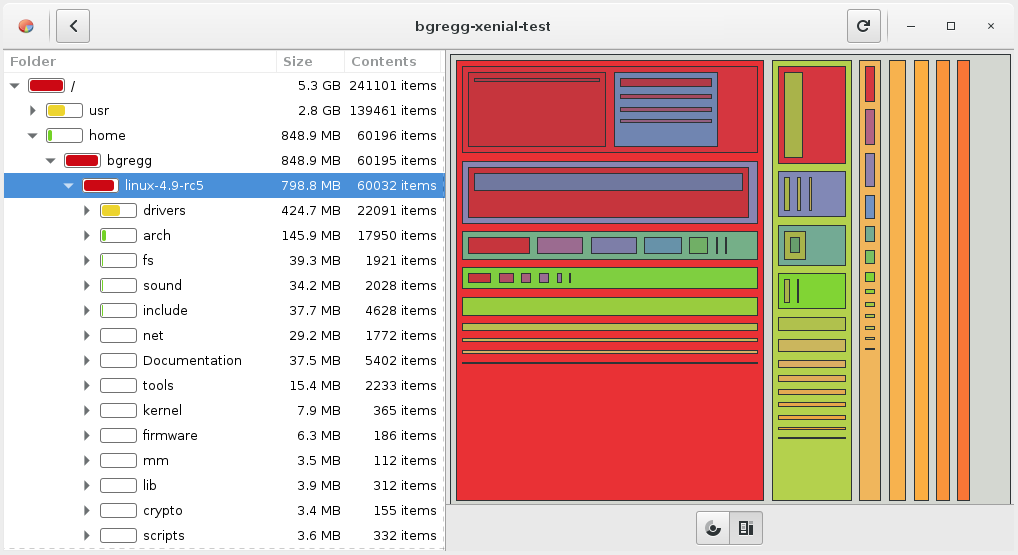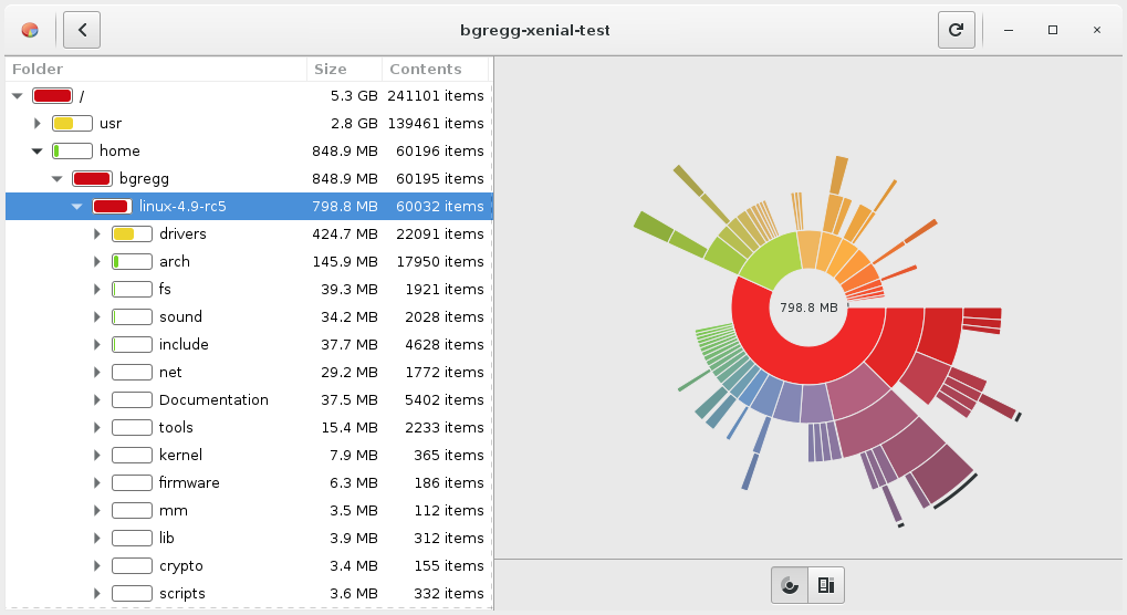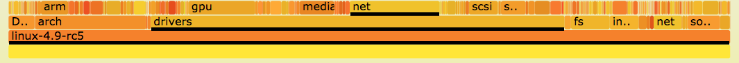 Yesterday I posted about flame graphs for file systems, showing how they can visualize where disk space is consumed. Many people have responded, citing other tools and visualizations they prefer: du, ncdu, treemaps, and the sunburst layout. Since there's so much interest in this subject, I've visualized the same files here (the source for linux 4.9.-rc5) in different ways for comparison.