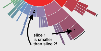 Deeper slices exaggerate their size, and look visually larger. The smaller-looking slice 2 in this image represents 27.7 Mbytes, whereas the larger-looking slice 1 is 25.6 Mbytes. This visualization is actually showing that slice 1 is smaller than slice 2, although I bet most people would think it was the other way around! The problem is that to understand this correctly requires the comparison of angles, instead of lengths or areas, which has been evaluated as a more difficult perceptive task.