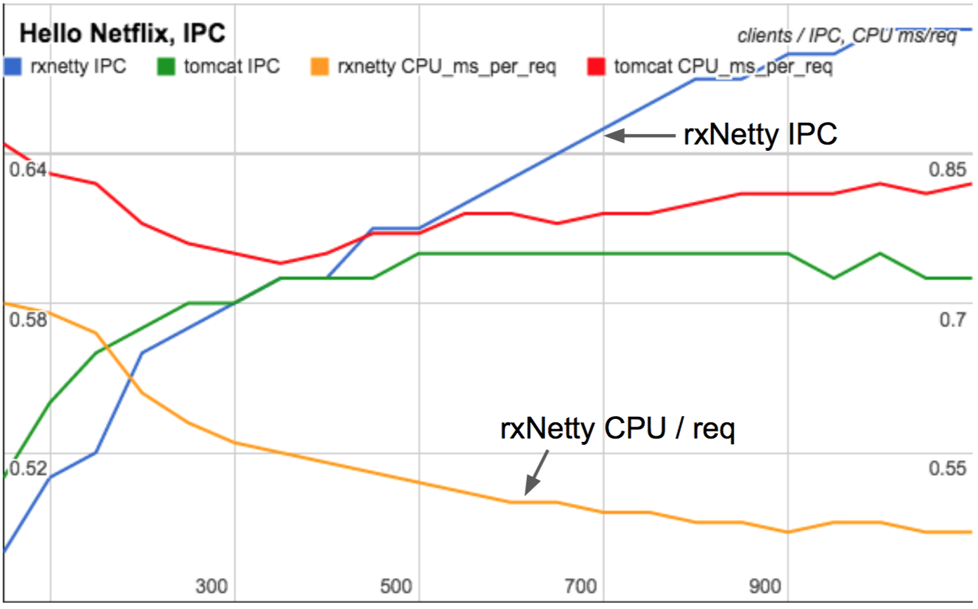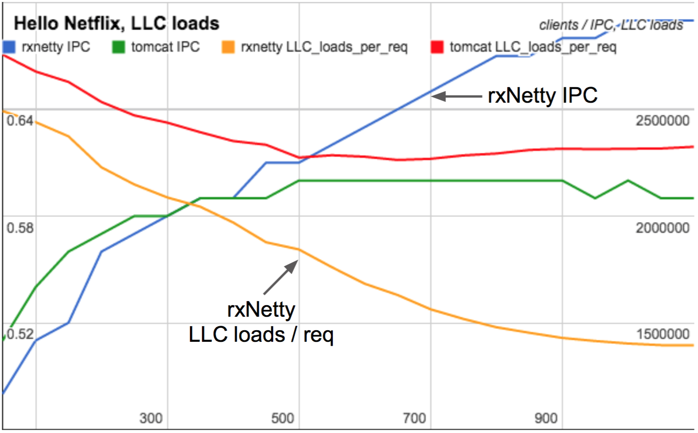 In 2015 I found PMCs crucial in fully understanding the performance differences between RxNetty and Tomcat as they scaled with client load. Tomcat serves requests using threads for each connection, whereas RxNetty uses event loop threads. Between low and high client counts, Tomcat's CPU cycles per request was largely unchanged, whereas RxNetty became more efficient and consumed less CPU per request as clients increased. Can you guess why?