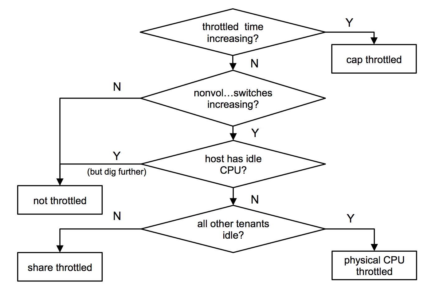 See the talk for more details, where I also included a few scenarios beforehand to see if the audience could identify the bottleneck. Try it yourself: it's hard (then try it with the above flow chart!). This may become easier over time as more metrics are added to diagnose states, and time in states, so also check for updates to cgroup metrics in the kernel.