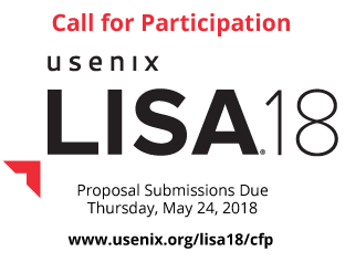 We hope you'll consider submitting a talk or tutorial, and plan to attend LISA 2018. Check out the Call for Participation for details about what we’d like to see at this year’s event and to see the great mix of individuals on the organizing committee. And please help us find LISA speakers by sending suggestions to lisa18chairs@usenix.org, and by sharing the CFP: