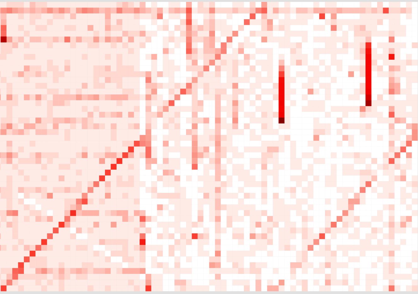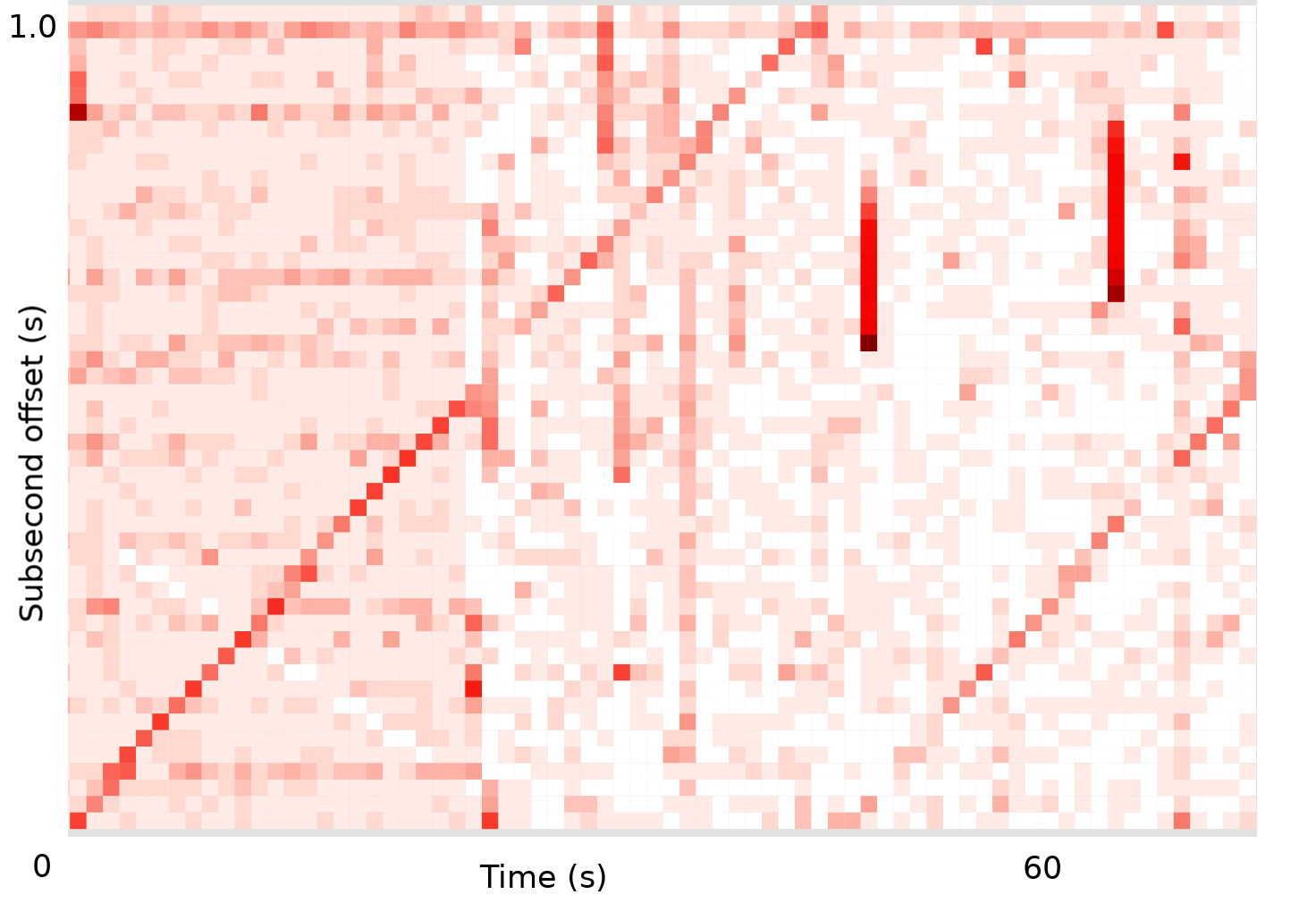 In summary: the x-axis are columns of whole seconds, and the y-axis is the fraction within each second, grouped as buckets (boxes). The box color scales to show the number of events that happened at that second and subsecond: darker is more. Here's a real subsecond offset heat map of CPU samples:
