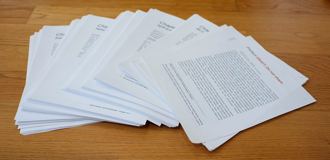 The last nine months have been hectic as I and others have added features to bpftrace, fixed bugs, and stabilized the API. The analysis of so many things unearthed many bugs and missing parts; fixing these was good not only for the book, but also for bpftrace. A special thanks to Mary Marchini, Willian Gasper, Alastair Robertson, Dale Hamel, Dan Xu, Augusto Mecking Caringi, and others, for all their work in these months. I'm also grateful that my fiancée, Deirdré Straughan, could find the time outside of her AWS job to do technical copy-edit. Thanks also to Alastair Robertson for creating bpftrace, Alexei Starovoitov and Daniel Borkmann for creating eBPF, and over forty other people involved in reviewing and contributing to this book.