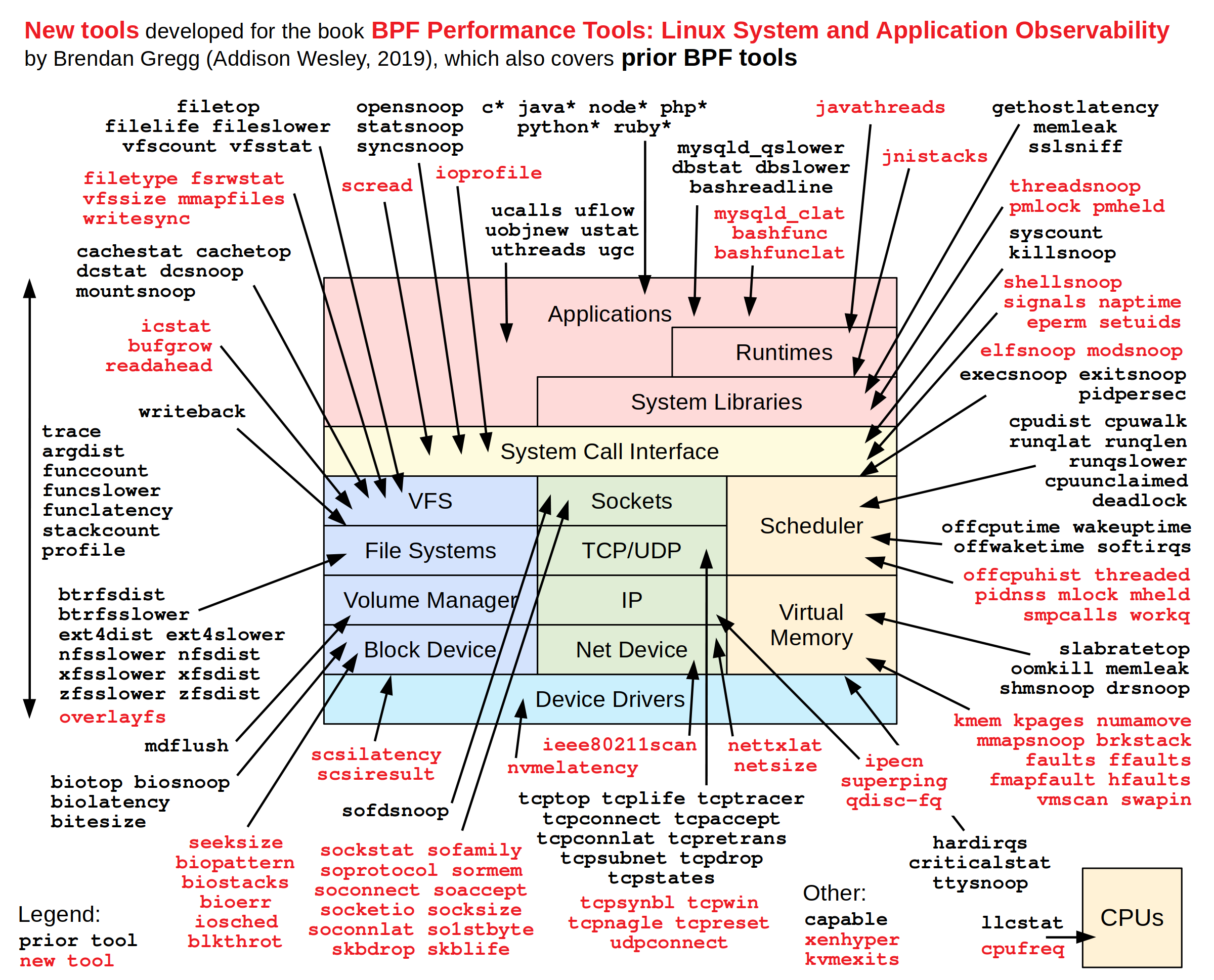 BPF (eBPF) tracing is a superpower that can analyze everything, and I'll show you how in my upcoming book BPF Performance Tools: Linux System and Application Observability, coming soon from Addison Wesley. The book includes over 150 BPF observability tools that you can run to find performance wins and troubleshoot software, and also shows you how to write your own. Over one hundred of these BPF tools are newly-developed for this book; you can see many of them in this diagram: