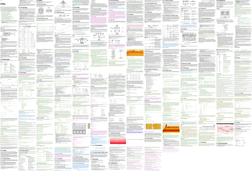 How much has changed since first edition? It's hard to say, but easy to visualize. As an example, the following shows Chapter 6, CPUs, where black text is from the first edition and colored text are the updates (this is a color scheme I use to show reviewers when text was changed; from oldest changes to newest: yellow, green, aqua, blue, purple, red):