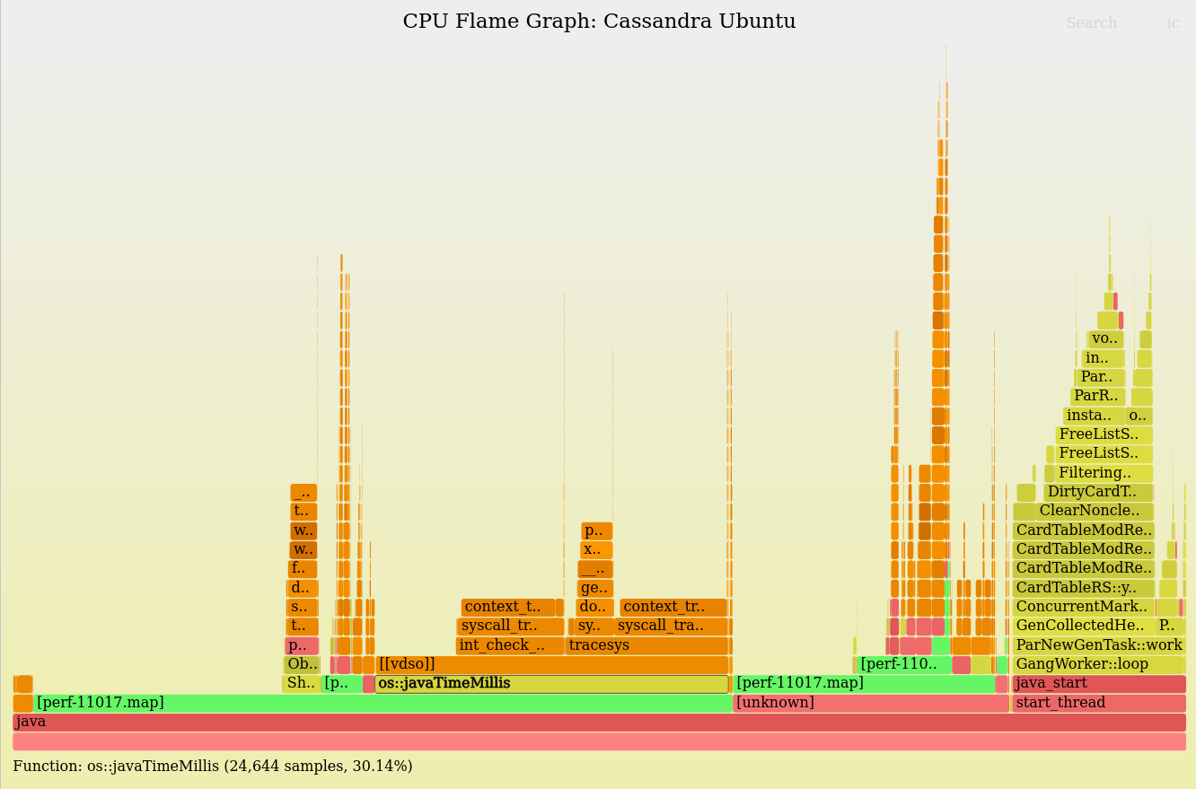 The broken Java stacks turned out to be beneficial: They helped group together the os::javaTimeMillis() calls which otherwise might have have been scattered on top of different Java code paths, appearing as thin stacks everywhere. If that were the case, I'd have zoomed in to see what they were then zoomed out and searched for them for the cumulative percent; or flipped the merge order so it's an icicle graph, merging leaf to root. But in this case I didn't have to do anything as it was mostly merged by accident. (This is one of the motivating reasons for switching to a d3 version of flame graphs, as I want the interactivity of d3 to do things like collapse all the Java frames, all the user-mode frames, etc., to expose different groupings like this.)