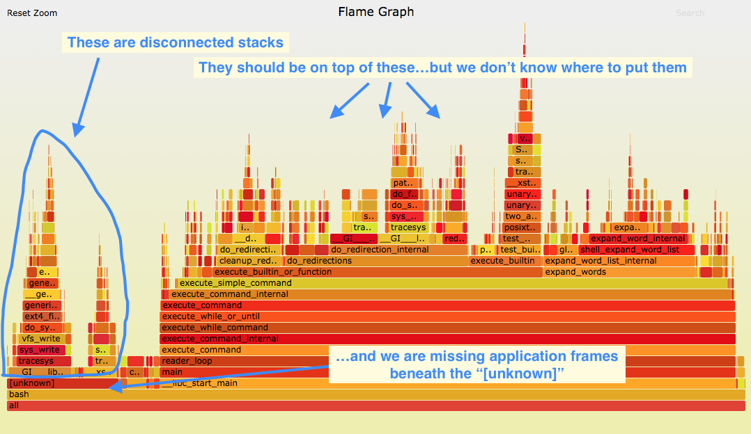 (Click for original SVG.) This is pretty common and usually goes unnoticed as the flame graph looks ok at first glance. But there are 15% of samples on the left, above "[unknown]", that are in the wrong place and missing frames. The problem is that this system has a default libc that has been compiled without frame pointers, so any stack walking stops at the libc layer, producing a partial stack that's missing the application frames. These partial stacks get grouped together on the left.