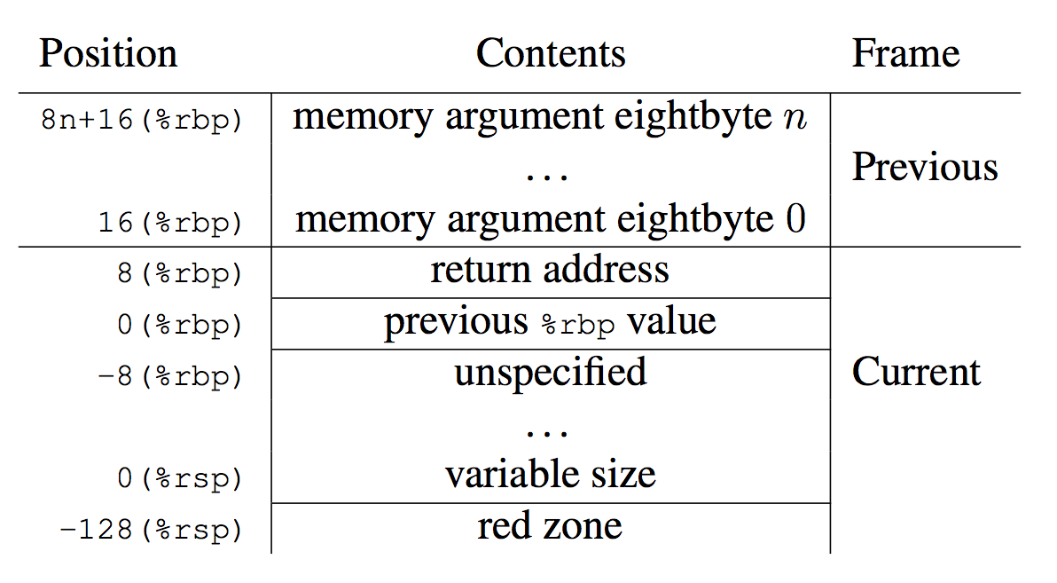 Figure 3.3: Stack Frame with Base Pointer (x86-64 ABI) |