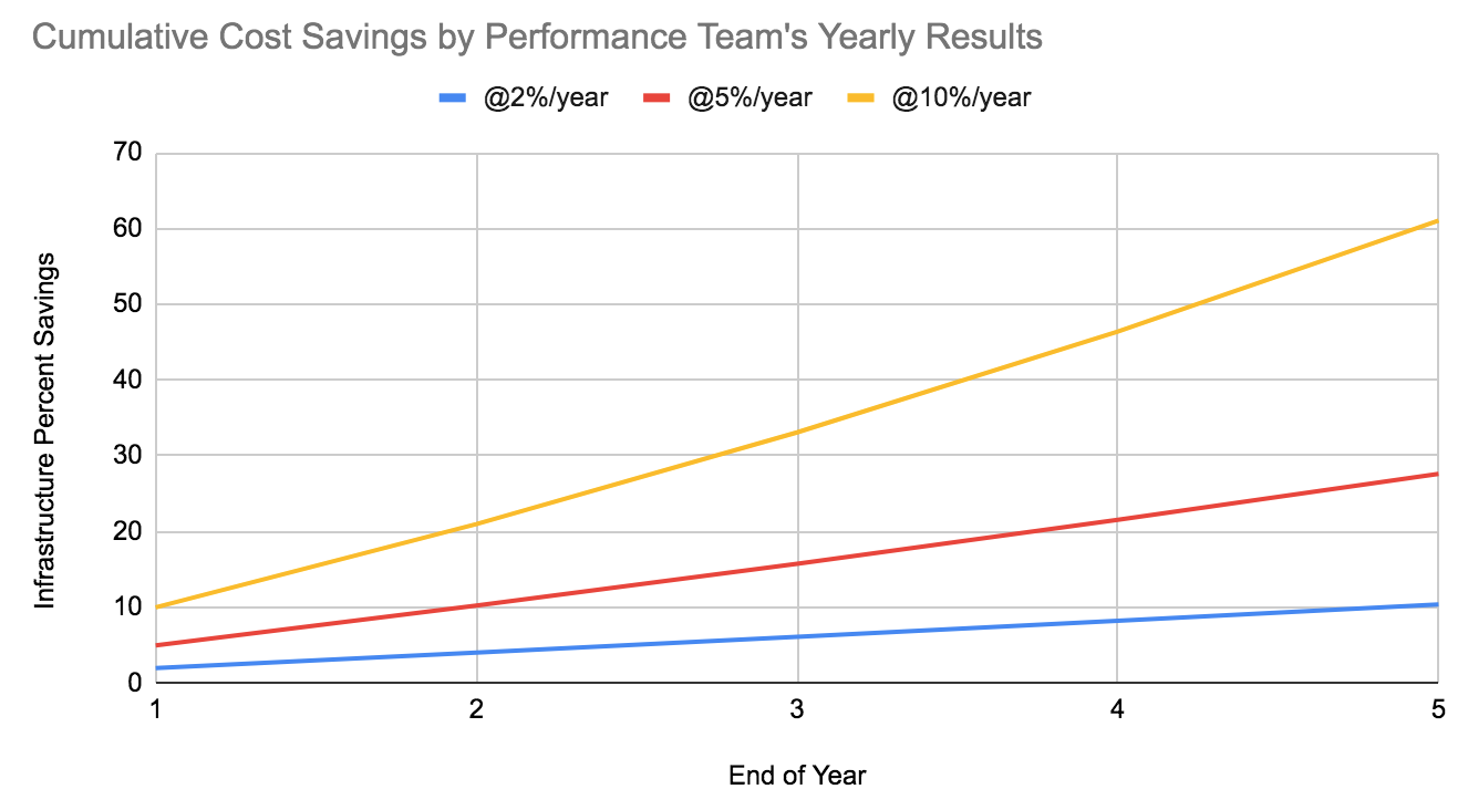 There are many reasons to hire a performance engineering team, such as infrastructure cost savings, latency reductions, improved scalability and reliability, and faster engineering. Cost savings alone can justify hiring a team, because a team should be targeting 5-10% cost reductions every year, which over the years adds up to become significantly larger: 28%-61% savings after 5 years.