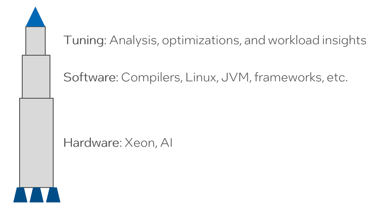 I recently presented this embarrassingly simple diagram to Intel's executive leadership, and at the time realized the value of sharing it publicly. The Internet is awash with comparisons about Intel (and other vendors’) product performance based on hardware performance alone, but the performance of software and then tuning can make a huge difference for your particular workload. You need all three stages to reach the highest, and most competitive, performance.