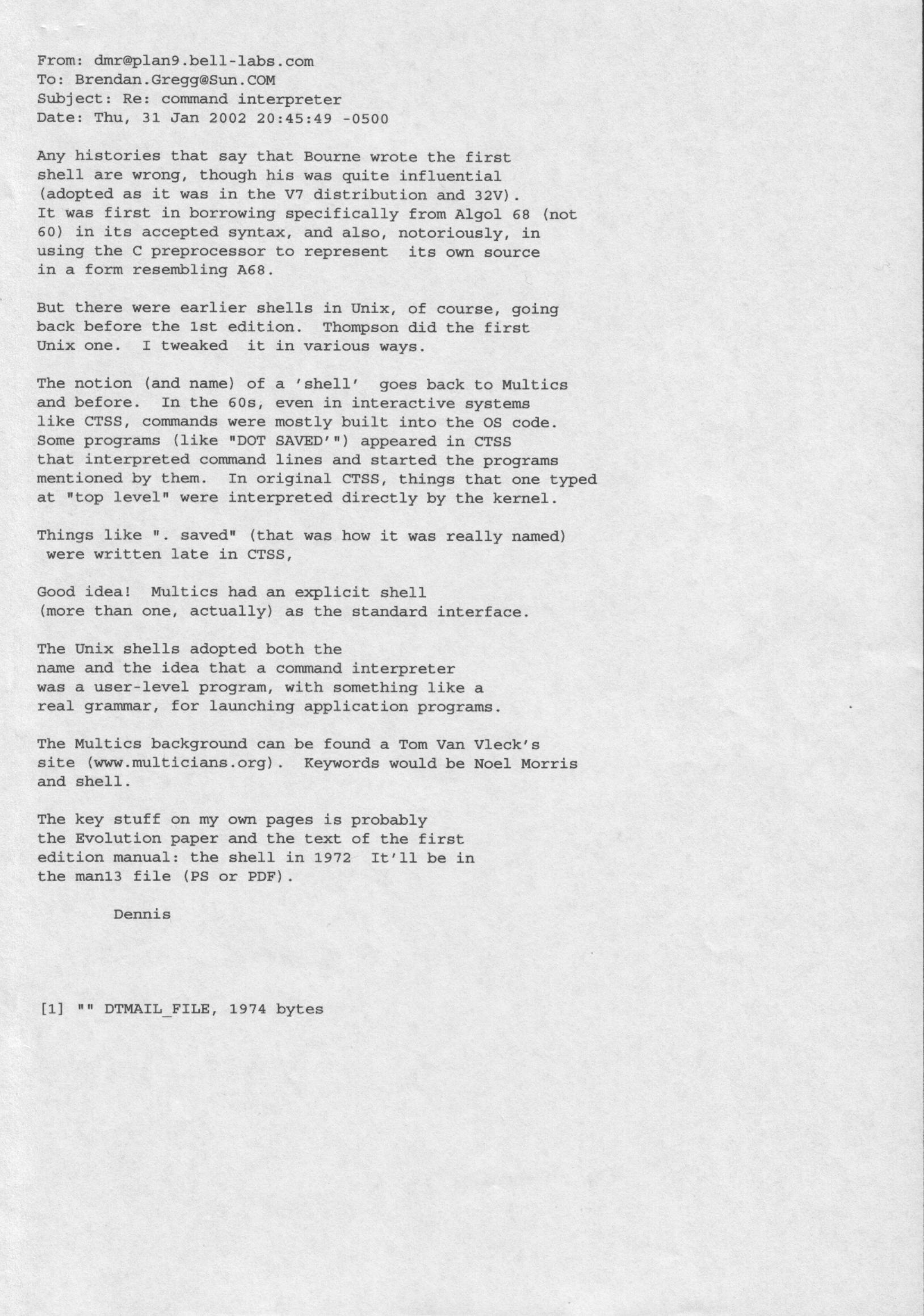 - In my first real job at Sun Microsystems in 2002, I noticed Sun had documentation claiming the first Unix shell was the Bourne shell, but I suspected it was wrong and could find nothing online to say otherwise. So I asked someone and got a reply in less than 24 hours explaining history of the first Unix shell. I found this recently (2025) and figured it should be online for Unix historical interest. His homepage style was the inspiration for mine.