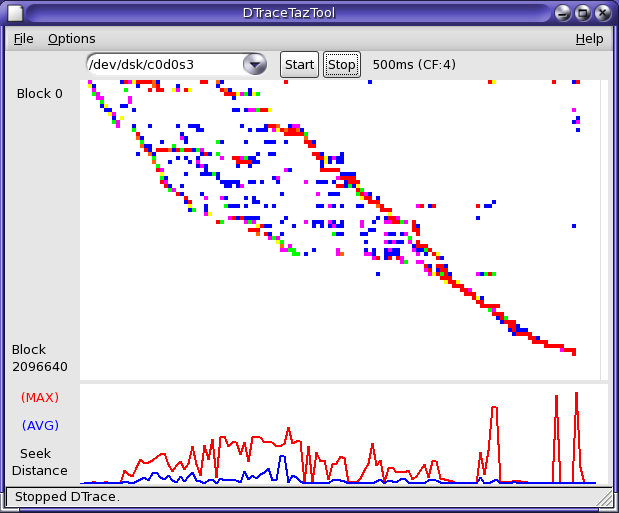 Several years ago, Richard McDougall wrote taztool - a GUI to display disk activity in an amazing and intuitive way. It used TNF trace data - a predecessor of DTrace. DTraceTazTool is a DTrace version of taztool. It is currently in development, and as such this is an alpha release. There are many more features to code, but it may already prove a useful tool.