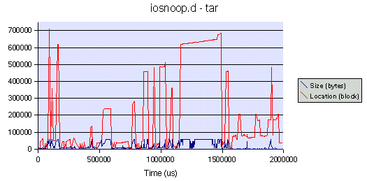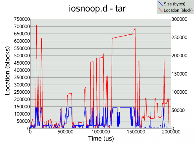 Here a tar command was executed (tar cvf /dev/null /var) to archive a directory, while iosnoop captured the first 2 seconds of disk activity. Some scattered activity is observed while tar is reading through directories, and sequential transfers can be observed as tar encounters large files.