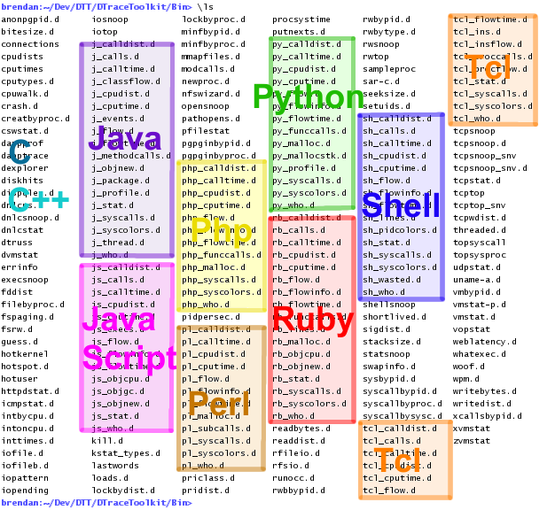 - 05-Oct-2007: DTraceToolkit 0.99 added many scripts to demonstrate basic tracing of different languages.
