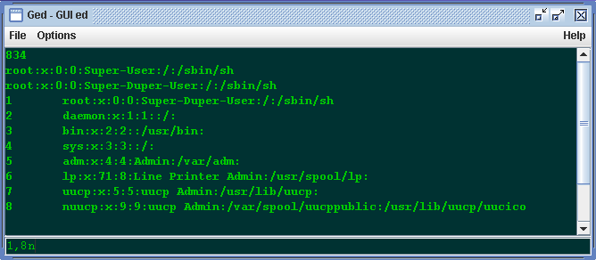 $ sudo ln -s /bin/ed /usr/bin/ed $ java -jar ged.jar /etc/passwd