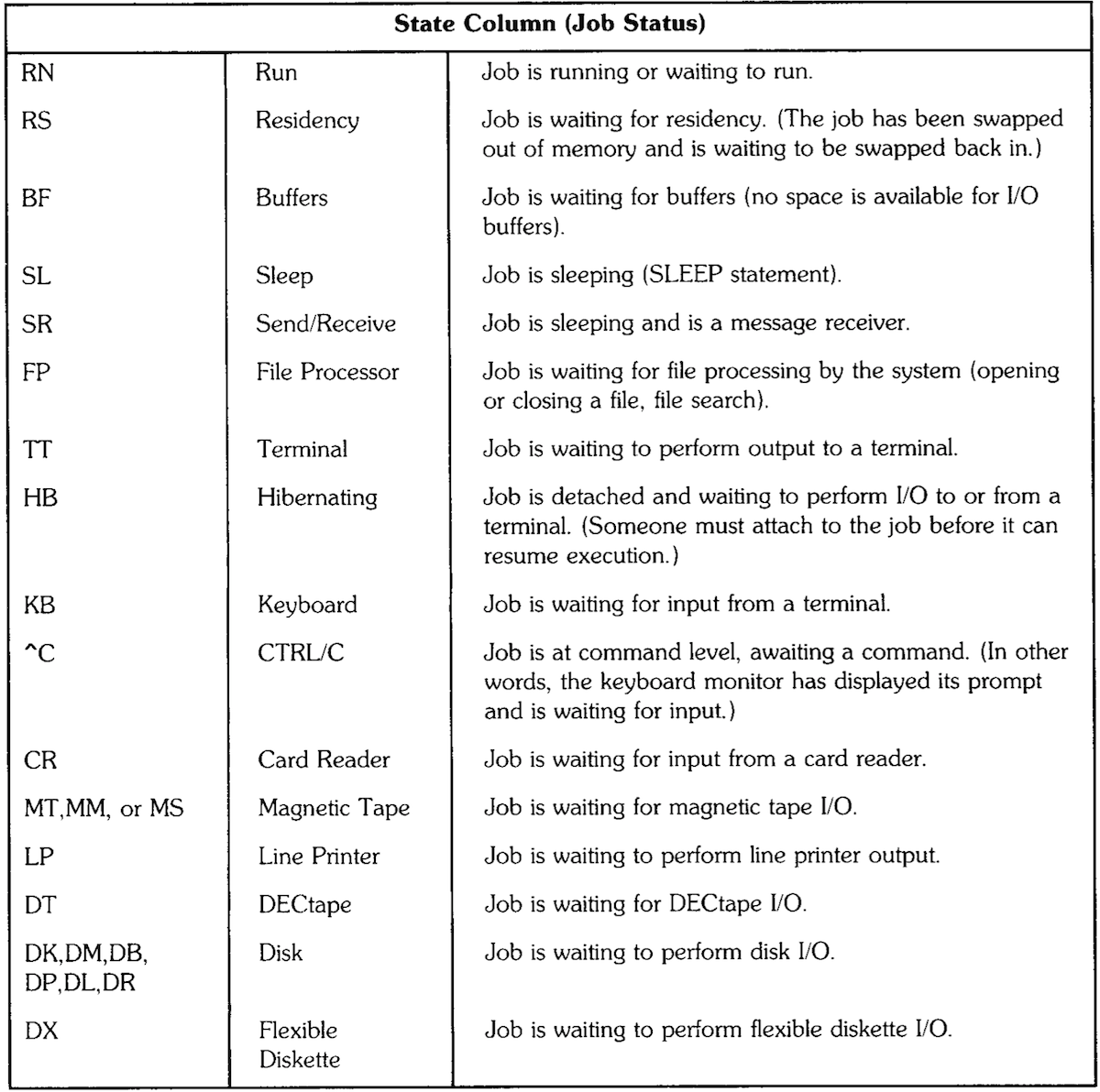 RSTS/E, another DEC operating system from the 1970's, eventually added Control-T and a larger breakdown of job states. This is from the RSTS/E System User's Guide, 1985, page 4-5: