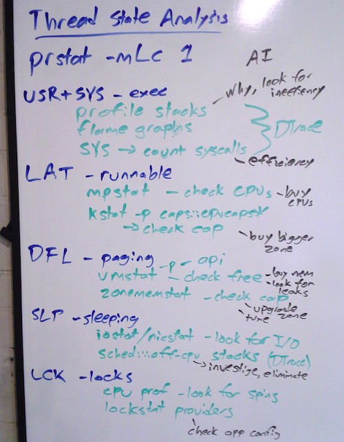 In preparing to use the TSA method, you can identify the set of states to measure for your OS, document the OS tools available to measure them, and how to further analysis each state. This can be shared with your team, providing everyone with a short procedure for analyzing performance issues. In a moment I'll provide a summary of this for Solaris as an example.