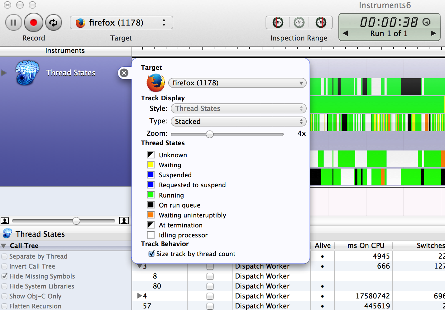 Check what thread states your OS currently provides, how they can be used, and if any additional states are useful to include. For example, Mac OS X provides various thread states in Instruments (based on DTrace), including "Waiting" and "Waiting uninterruptibly".