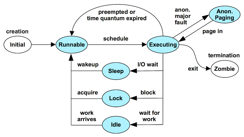 The Runnable, Anonymous Paging, Sleeping, and Lock states measure time spent waiting while performing work: a measure of latency. Tuning these latency states often provides the greatest wins, as their state time can be reduced to zero. They may also provide the easiest wins, depending on the tools the OS provides to analyze them.