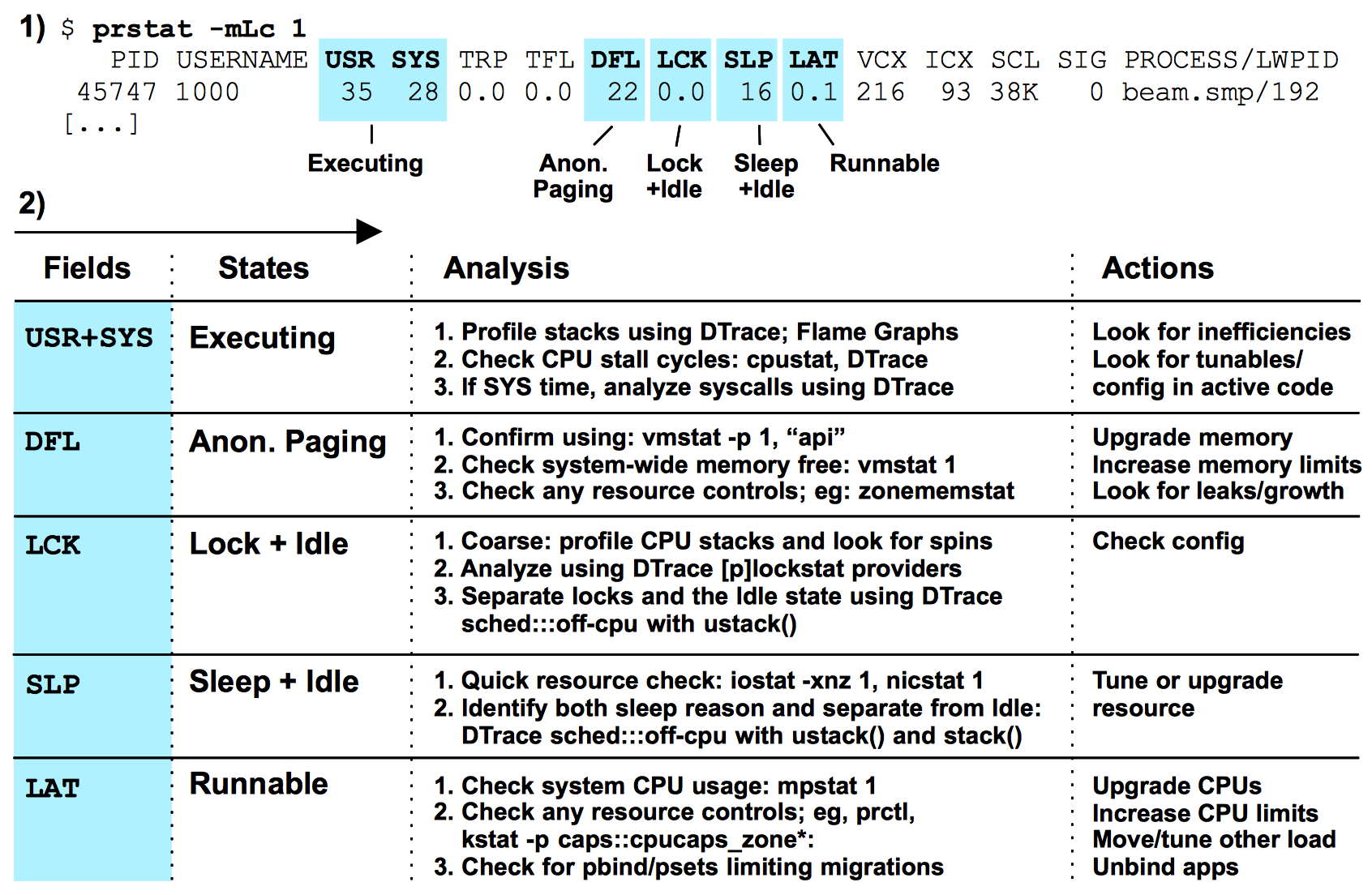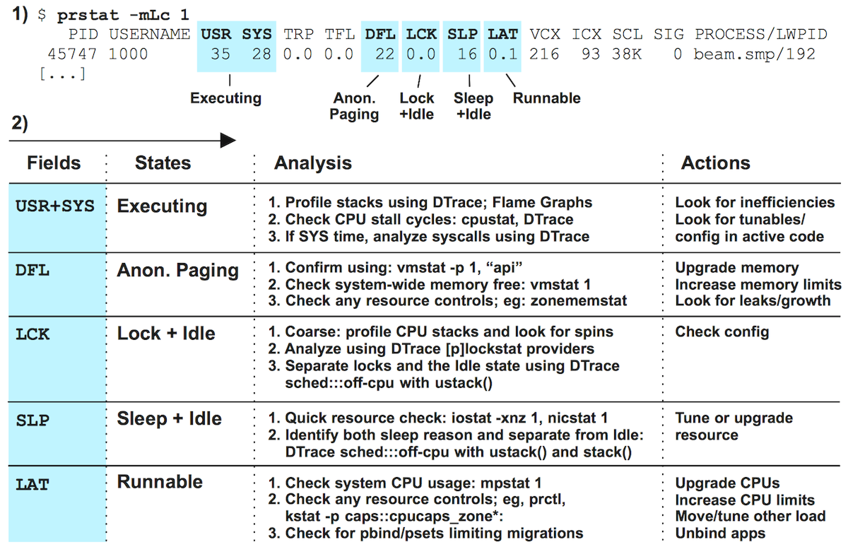 This prstat(1M) output shows 63% Execution time (35 + 28), 22% Anonymous Paging, and 16% Sleep. These states could then be investigated in that order, using the tools described here.