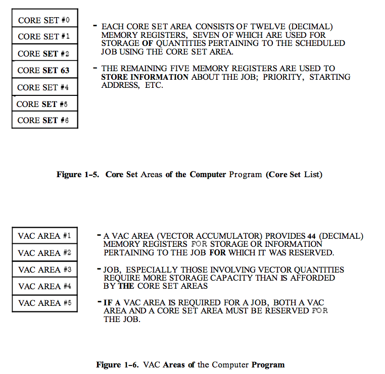 Some of these details may be familiar to space ethusiasts: 1201 ("NO VAC AREAS") and 1202 alarms famously occurred during the Apollo 11 descent. ("VAC" is short for "vector accumulator", extra storage for jobs that process vector quantities; I think wikipedia's description as "vacant" may be incorrect).