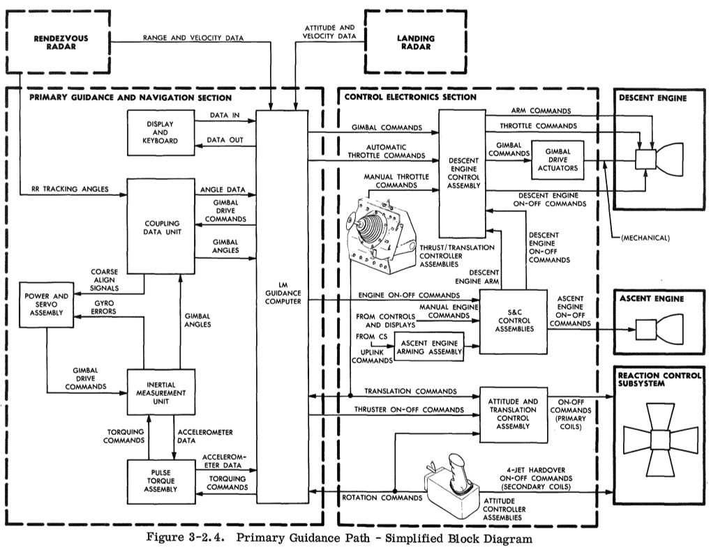Given Apollo 11's 1201 alarm, analysis can continue using other methodologies, such as workload characterization. The workload is mostly applied via interrupts, many of which can be seen in the functional diagram. This includes the rendezvous radar, used to track the Command Module, which was interrupting the AGC with work even though the LM was performing descent. This is an example of finding unnecessary work (or low priority work; some updates from the radar may have been desirable so that the LM AGC could immediately calculate an abort trajectory and CM rendezvous if needed).