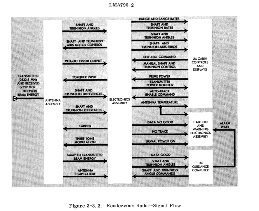 As a harder example, I'll examine the rendezvous radar as a resource. Errors are the easiest to identify. There are three types: "DATA NO GOOD", "NO TRACK", and "SHAFT- AND TRUNNION-AXIS ERROR" signals. Utilization is harder: one type may be utilization of the drive motors - defined as the time they were busy responding to angle commands (seen in the functional diagram via the "COUPLING DATA UNIT"). I'll need to read the LM docs more to see if there saturation characteristics either with the drive motors or with the returned radar data.