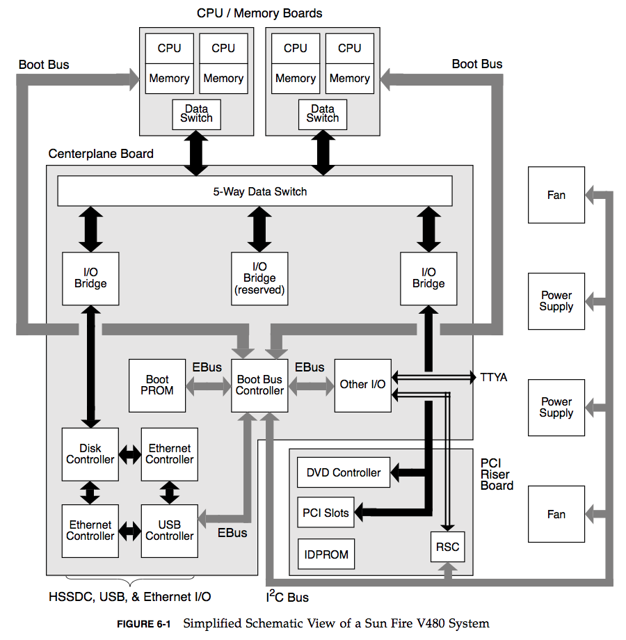 Another way to iterate over resources is to find or draw a Functional Block Diagram for the system. These also show relationships, which can be very useful when looking for bottlenecks in the flow of data. Here is an example from the Sun Fire V480 Guide (page 82):